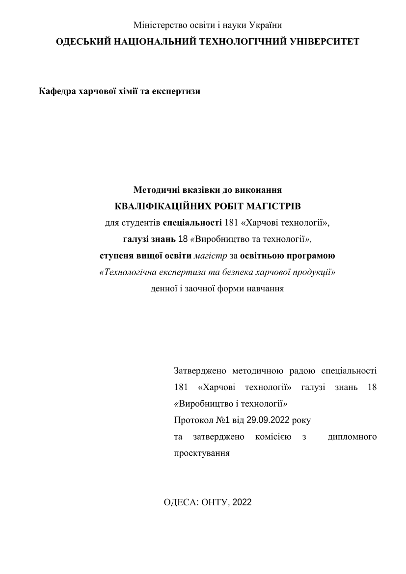 | 664(07) | | М54 | Методичні вказівки до виконання кваліфікаційних робіт магістрів [Електронний ресурс] : для студентів спец. 181 "Харчові технології", галузі знань 18 "Виробництво та технології", ступеня вищої освіти магістр за освітньою програмою "Технологічна експертиза та безпека харчової продукції" ден. і заоч. форми навчання / К. І. Науменко, А. І. Капустян, Л. С. Гураль, Н. К. Черно ; відп. за вип. А. І. Капустян ; Каф. харчової хімії та експертизи. — Одеса : ОНТУ, 2022. — 45 с. | |